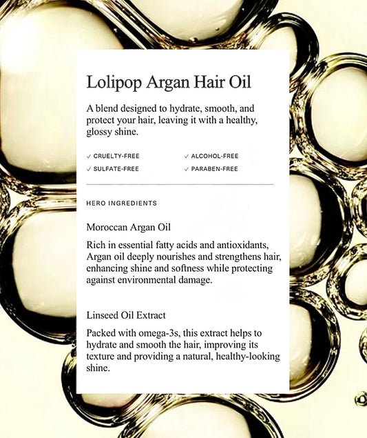 Fivessi Lolipop Argan Oil is crafted with a powerful blend of Argan Oil, Linseed Extract, and weightless silicones to deeply nourish and protect your hair. Argan oil is naturally rich in antioxidants, Vitamin E, and essential fatty acids that help repair and strengthen hair from root to tip. Linseed extract boosts hydration and smoothness, supporting healthier-looking strands over time.