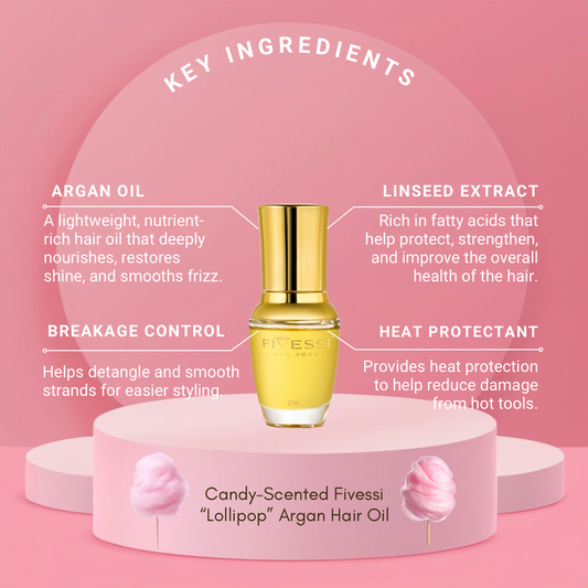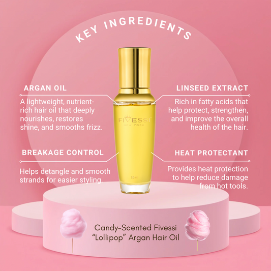 Fivessi Lolipop Argan Oil is crafted with a powerful blend of Argan Oil, Linseed Extract, and weightless silicones to deeply nourish and protect your hair. Argan oil is naturally rich in antioxidants, Vitamin E, and essential fatty acids that help repair and strengthen hair from root to tip. Linseed extract boosts hydration and smoothness, supporting healthier-looking strands over time.